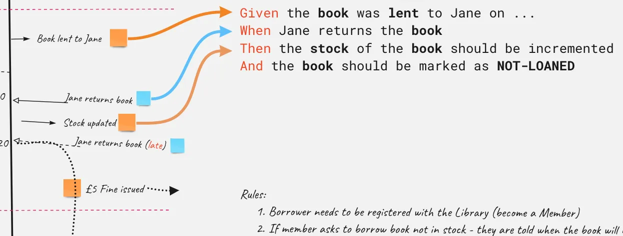 Each example is written down on sticky note and placed below the rule they illustrate. The examples should be as concrete as necessary to remove ambiguity from the rule that they are illustrating. Imagine we had a rule that says books can only be taken out for 2 days, otherwise a fine is issued. A relevant example used to illustrate this rule might be: “Jon attempts to return a book he took out 3 days ago”