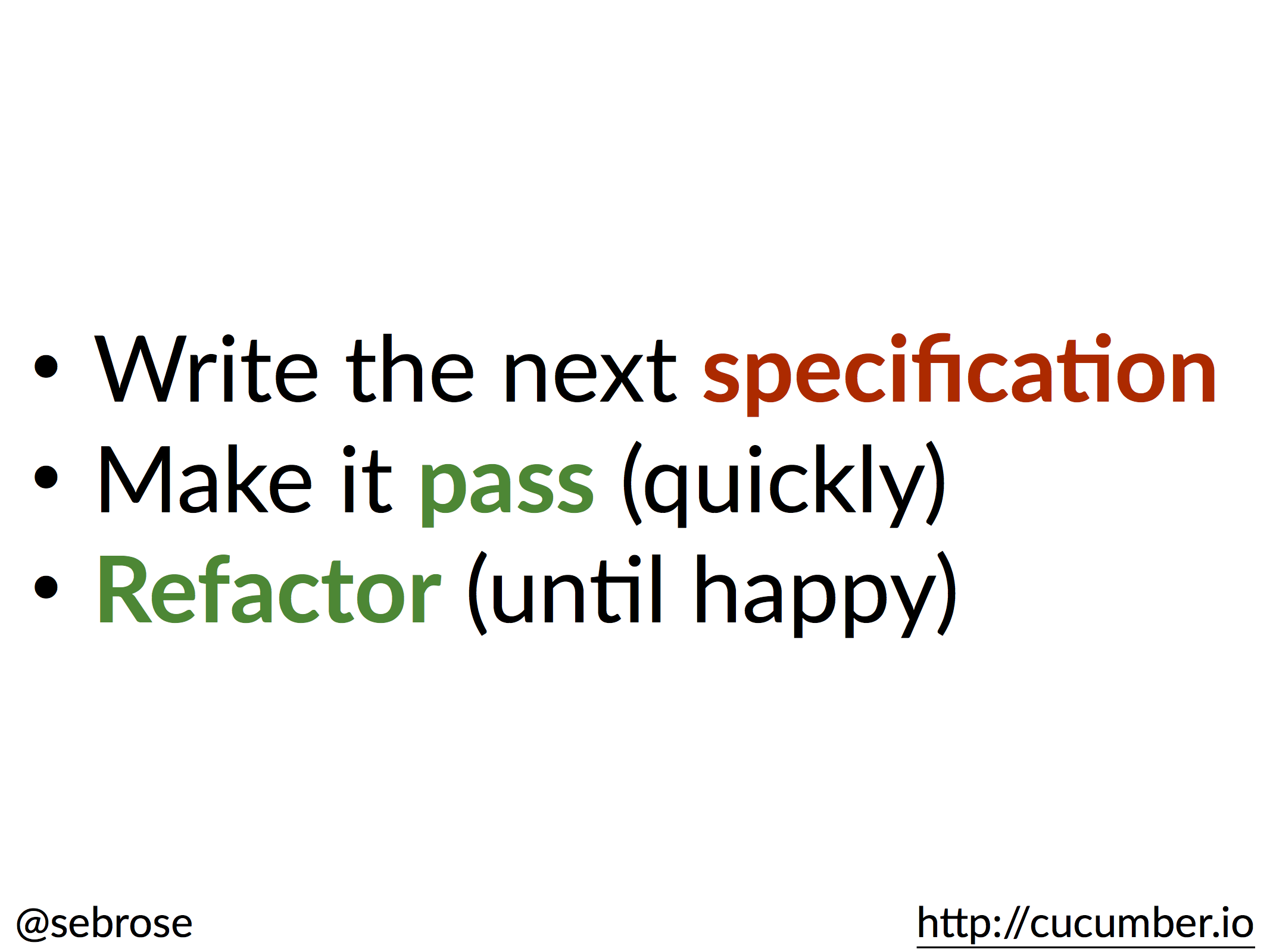 The "xDD" question. What is it all about? The reason it’s called ‘Test-Driven’ or ‘Behaviour-Driven’ or ‘Acceptance Test-Driven’ is that you have to specify the behaviour before you do the implementation. There is no ‘we sort of do Behaviour-Driven’, ‘we sort of do Test-Driven’, ‘we write the tests in the same sprint’. You have to write them first. That’s what drives them, that’s how it becomes a design process. It’s the failing specification, it’s the fact that you see it fail, which is driving you to do the implementation. That’s what pushes the developer; that’s what the developer uses to write the code.